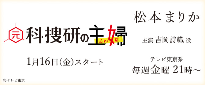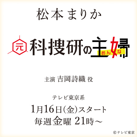 松本 まりか・入江 甚儀「元科捜研の主婦」 テレビ東京系 21:00〜21:54 松本 まりか:<主演>吉岡詩織 役 入江 甚儀:岡部一郎 役
